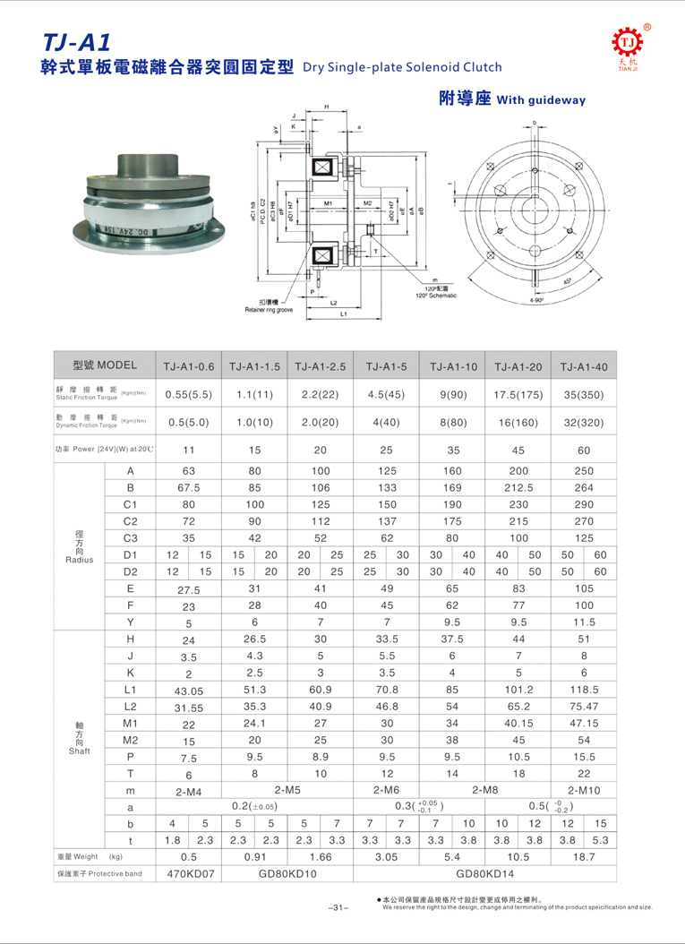 天機(jī)傳動(dòng)工業(yè)單片電磁離合器TJ-A1型號(hào)由銜鐵(電樞板)、定子、轉(zhuǎn)子、板型彈簧片、磁性線圈、來令片、軸承、鐵導(dǎo)座等元件構(gòu)成,統(tǒng)一使用DC24V,標(biāo)準(zhǔn)規(guī)格0.6-40KG。