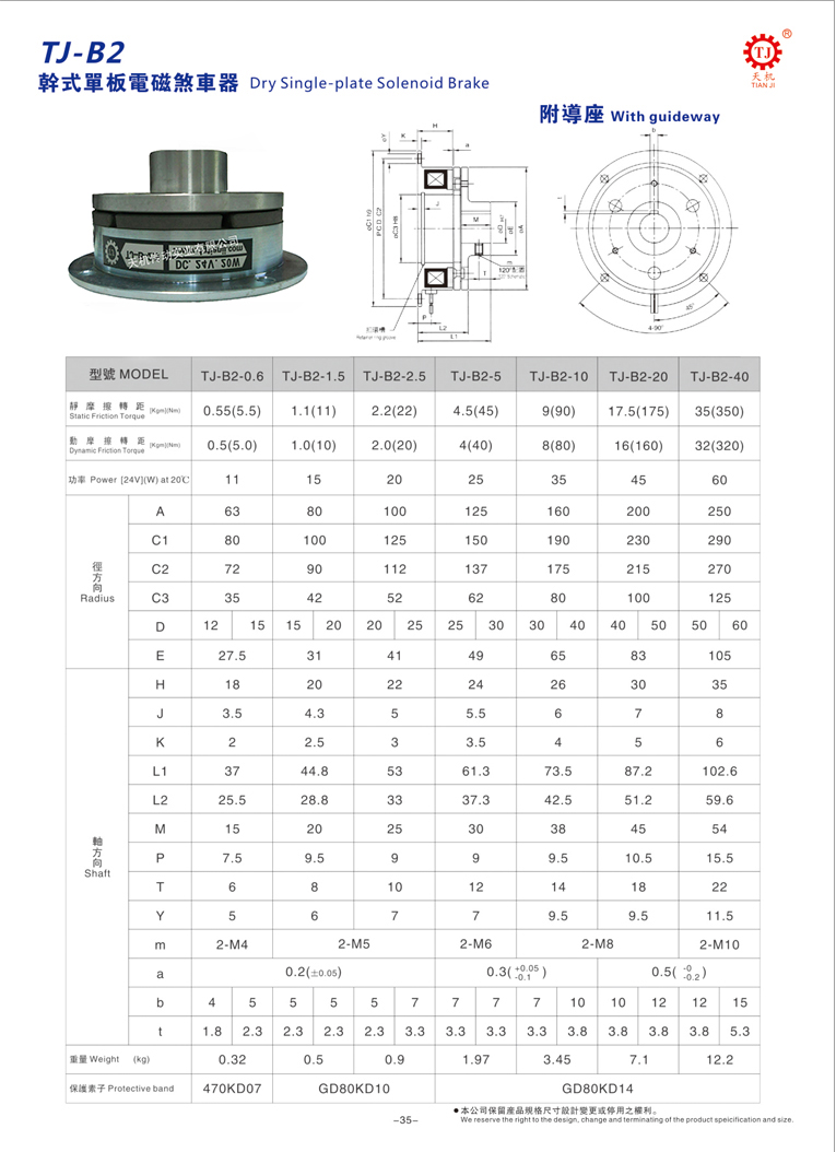 天機(jī)傳動(dòng)干式單片電磁制動(dòng)器標(biāo)準(zhǔn)TJ-B2型(剎車(chē)器)由銜鐵(電樞板)、定子、板型彈片、磁性線圈、來(lái)令片、鋁導(dǎo)座等元件構(gòu)成,統(tǒng)一使用DC24V,標(biāo)準(zhǔn)規(guī)格0.6-40KG。