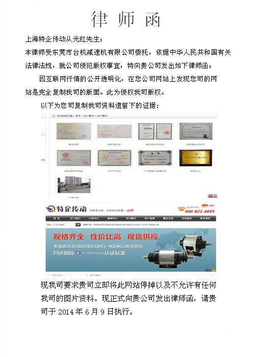 上海特企傳動復制我司網(wǎng)站的版面,侵犯我司版權。依據(jù)中華人民共和國有關法律法規(guī),2014年6月9號我司向上海特企傳動發(fā)出律師函,要求上海特企立即停止網(wǎng)站的運行以及去掉我司的圖片資料。